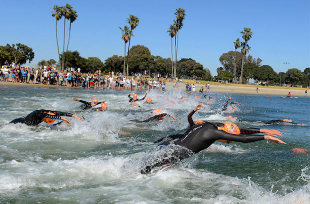 A pro launches into Mission Bay on the second lap of the swim at the $20,000 Super Sprint Triathlon in San Diego.