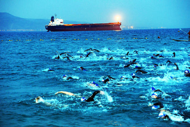 Triathlete start just before dawn at the Israman Triathlon in Eilat.