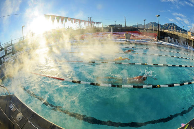 Steam rises from RallySport heated pool on 19 degree day in Boulder.