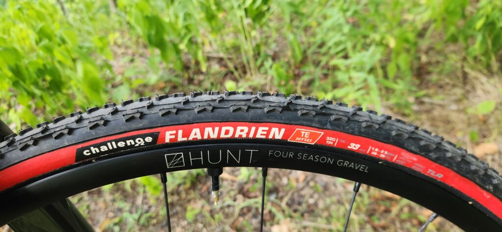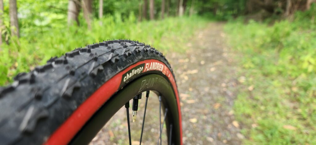 I mounted my test set of Flandrien tubeless on a pair of HUNT 4 Season Gravel wheels with an internal width of 25 mm. The HUNT rims are hooked, but you can run the Flandriens on hookless. I found that the 25 mm internal width spread out the tire and reduced its height compared to what I’m used to seeing in a Challenge 33 mm handmade tubeless tire. Arguably, this could mean the tire is less likely to fold at low pressures when cornering, but also more likely to bottom out on roots and rocks. We are talking millimeters here, so it may not actually make as big a difference as I am anticipating.