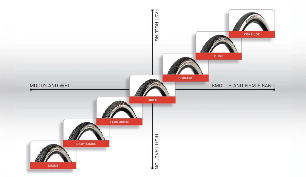 The Flandrien gained popularity because of its range of use beyond the all-purpose Grifo. The Flandrien’s side knobs are more aggressive compared to the Grifo, giving the tire more bite when the ground gets loose. And the center knobs are more spaced out than the Baby Limus and the Limus, allowing the Flandrien to shed mud and bite down into the the ground beneath a mud layer.
