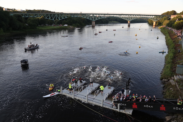 Biggest Current Ever: Almost all of the top professional times in the swim were under 50 seconds per 100 meters. The Kennebec River was moving this morning. We've had a lot of rain here in the northeast over the last month, including last night, which only increased the water flow. How fast was it? During the professional warm-ups, none of the pros were making it all the way to the one upstream buoy that they had available to them. It looked like an Endless Pool. It would have been carnage to try to swim upstream at all, especially with over 2,000 age group athletes registered.