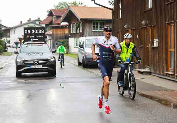 The Western edge of Germany has been battered by historic rains and floods the last week, and the Allgäu region is only 300 miles south of the epicenter. That rain soaked the bike leg, and Frodeno said after the event, “It’s not exactly what is referred to as Frodeno weather. It got quite cold on the bike.“