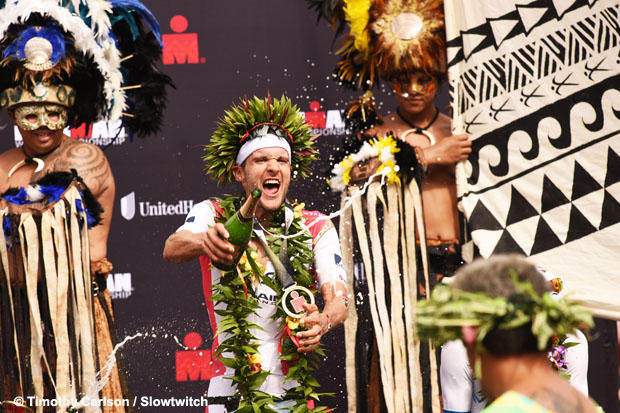 Jan: Not really. I knew he was four and a half minutes back. The lead was still growing even though I was feeling pretty horrible. Which allowed me to very much conserve my effort. That is one of those things. This is a championship race. A championship race means that the time in the end is really irrelevant. If you look at it, records are meant to be broken by someone somewhere some day. Hawaii is so condition dependent. I really couldn't give a rat's ass if the winning time today was 8:30 or 8:06, or, of course, the big talk of a sub-8 hour race. Yeah maybe one day. But that's more for the fan and the media to speculate and talk about. Whereas now I am a two-time World Champ. And I am pretty stoked.