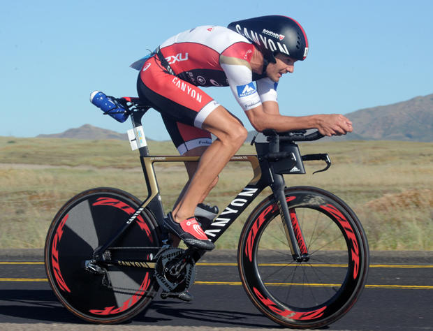Frodeno rides with a lot of drop. He pays a lot of attention to aerodynamics, based on his bike, his drop, his front and down tube drink systems, and the narrow width of his armrests.