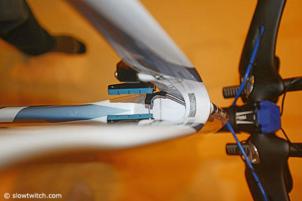 The front brake cable slips under the Oval bar into a headtube hidden space.