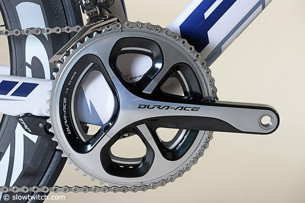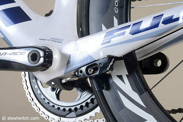 The Shimano Dura-Ace crank partially hides the TRP brake.