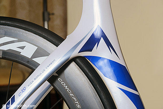 The seat cluster appears to be much narrower than the one on the D-6. Oval 981 carbon clincher wheels are stock on this bike.