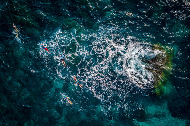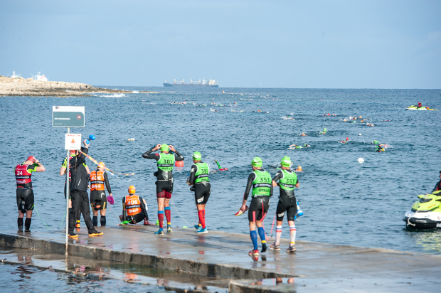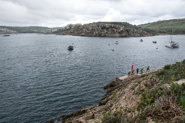 Most of the swims during the ÖtillÖ Malta event were protected but at the end the long course teams had to battle heavy winds and big waves. Here the female team Les Niçoises with Isabelle Hallifax and Lise Viterbo ready themselves to go all in.