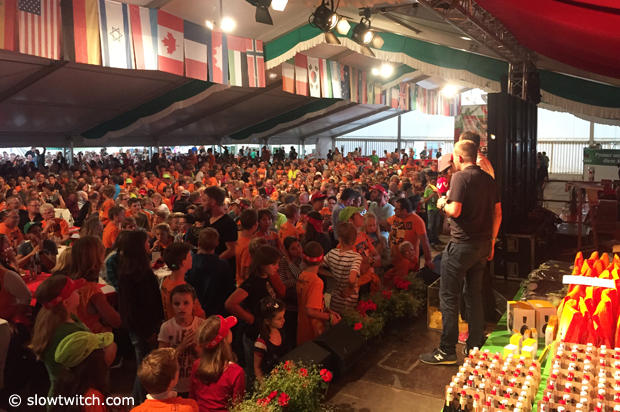 The 2015 Datev Challenge Roth had about 6,000 volunteers this year and these fans are fully and passionately involved. The Challenge family thanks the volunteers whenever they can and wherever they go, but they put up a big thank you with a shindig called Helferfest (helper party). The first Helferfest usually takes place a few hours after the big awards party in the tent in Roth, and then a few weeks later there is another Helferfest in Hilpoltstein for the southern counties. About 1,200 raffle prizes, food and drinks are offered to the volunteers and it is a big social gathering as well. In the end that means about $32,000 back to the volunteers. Among the main raffle prizes were a trip for two for a week to the Playitas resort on the Canary Islands, 9 weekends for two in the Mohrenwirt Wellness Hotel in Austria, big screen TVs, plus other electronic gear. Below are some impressions from the 2015 Challenge Roth Helferfest in Roth.
