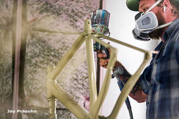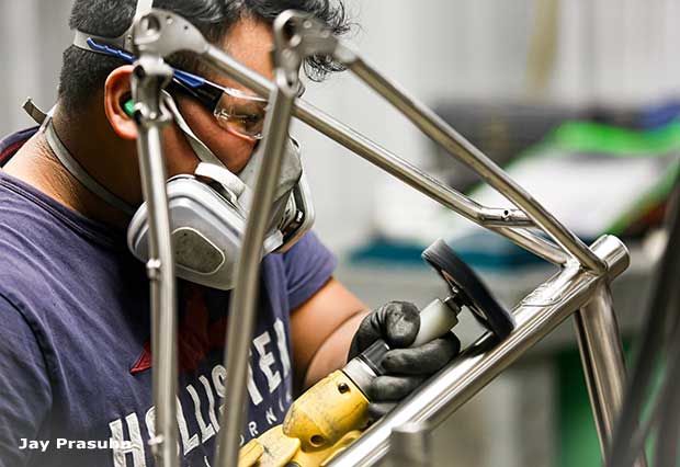 There are two paint booths running full tilt, and you see a painter at work in the image below. Interesting to me was that the assembly was pretty old school. What we see in Asian factories is mass production. One guy does only bottom bracket installs. The problem with this – from my perspective – is that you often get workers who don’t really understand the importance of what they’re doing. They don’t understand the results of over-tightening. They don’t know how or when to identify something with the frame or a part that could cause a failure. At this factory, it appeared to me that one person builds a frame into a bike from the bottom up, and I’ve always felt it comforting when the person building a bike – welding a frame, hanging the parts, and all the way back to cutting molds or making tools – understands the purpose of the thing he or she is making or assembling.