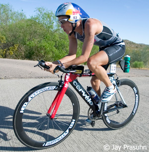 A fairly large pro field entered the waters of Town Lake in Tempe, AZ for the 2008 Ironman Arizona spring edition. Halfway through the swim James Bonney surged away from Rene Goehler and came back into T1 with a 20 second cushion. A small pack containing TJ Tollakson, Wolfgang Guembel and Jonathon Caron was almost 2 minutes further back.