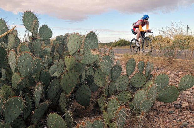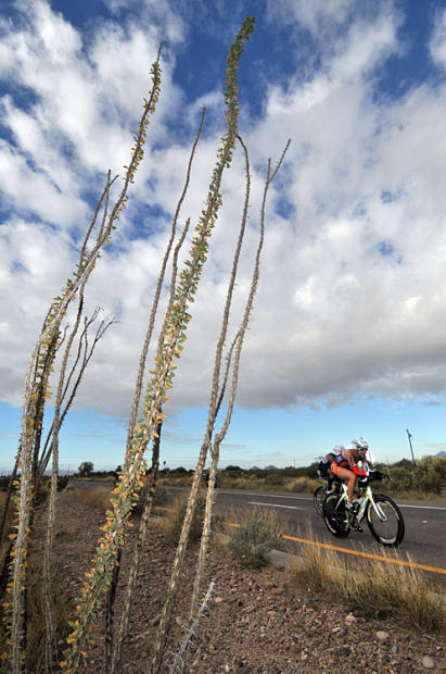 IM Arizona biker rides past elegant spiked desert flora on the Beeline median.