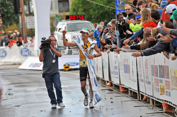 Timo Bracht raises the We’re Number One finger celebrating his course record 8:07:16 victory in the finish chute.