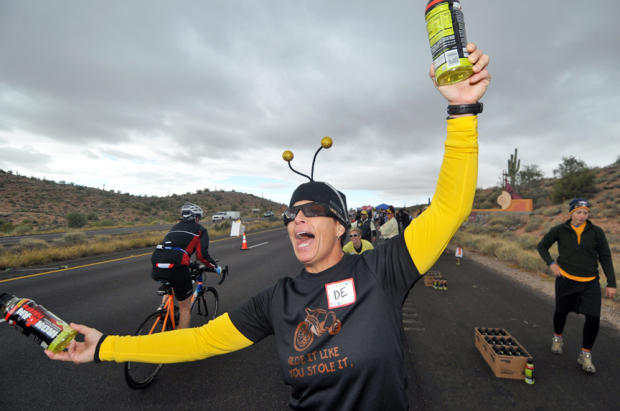 Aptly dressed for the Beeline Highway, an energetic aid station volunteer offers tasty drinks to the passing throngs.