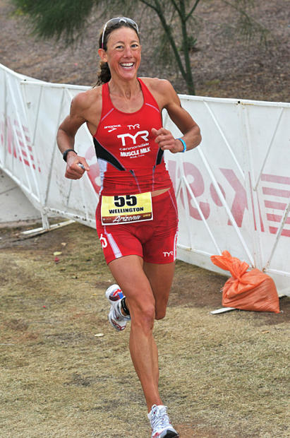 Miss Wellington smiles fetchingly while dashing off a Ironman brand record 2:52:55 marathon to close out her 8:36:13 day in the sun.