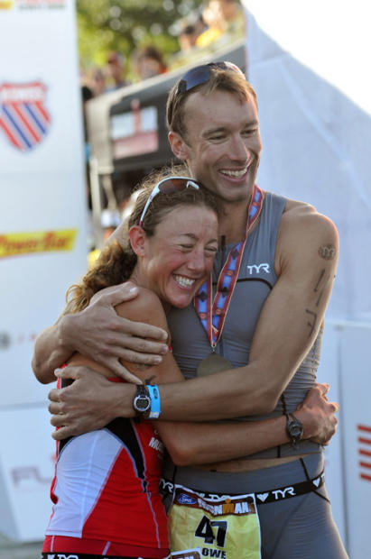 Although Chrissie Wellington’s first place finish trumped boyfriend Tom Lowe’s 3rd, he avoided getting chicked by 25 minutes. Refusing to accept any gender handicap, Wellington agreed to do dishes for a year to honor his household victory. They celebrated with a hug.