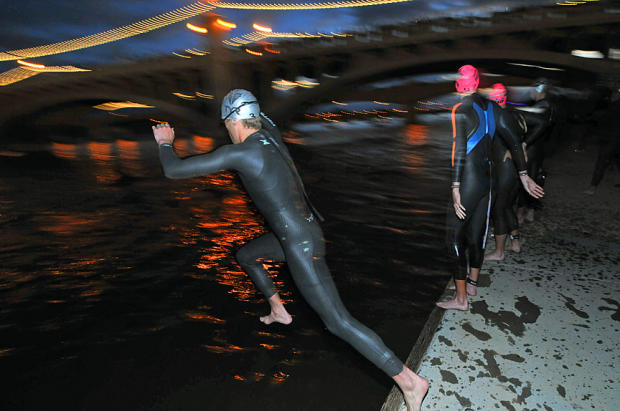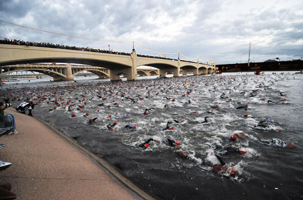 Stepping into the 61-degree liquid of Tempe Town Lake to start a little swim-bike-run workout.