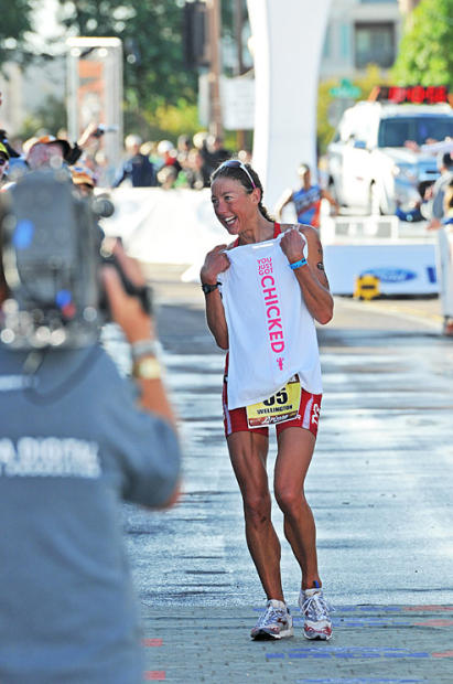 Chrissie Wellington models a T-shirt handed to her by a fan at the finish line which boldly states “You just got Chicked!” Only seven men avoided that fate.