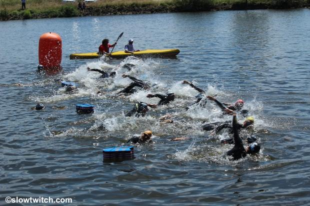 The Pro men are lined up on the River Moselle for the 1pm wetsuit legal start.