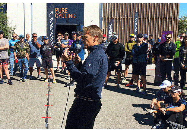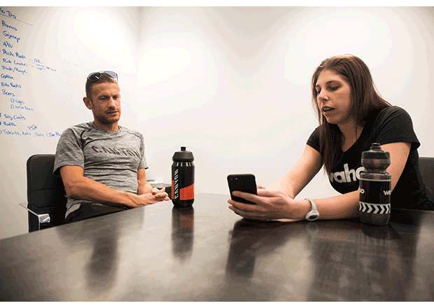 Above, Lionel Sanders is palavering with Wahoo Fitness’s Stacy Perlis. Mostly I just wanted to write palavering. I wanted to use a word that has never appeared in the over 7,500 articles and 13 million posts on our Reader Forum. Alas, after checking, “palavering” has been used twice before here. Epic fail on my part.