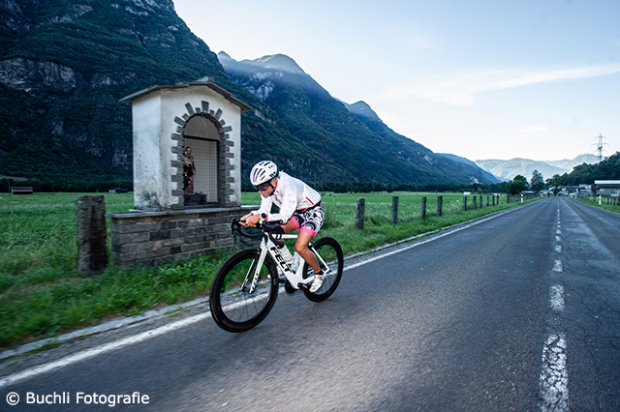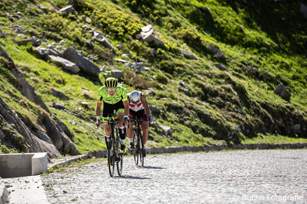 Christian Rutschmann from Switzerland was the first athlete to hit the historical cobblestone road up to the Gotthard pass and he had opted for a BMC road bike with clip on bars and mid sized carbon wheels, and in the end he was second.