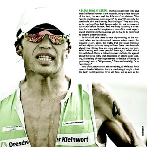 What surprised me was the work of a photographer with whom I was unaware: Robert Murphy. His Kona Gallery photos were among the best triathlon action shots I've ever seen. His pics and others were displayed with Erica Krystek's spot-on art direction.