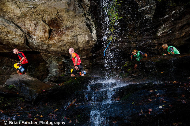 The fastest path was straight under the waterfall, but many teams opted to squeeze through behind the rock.
