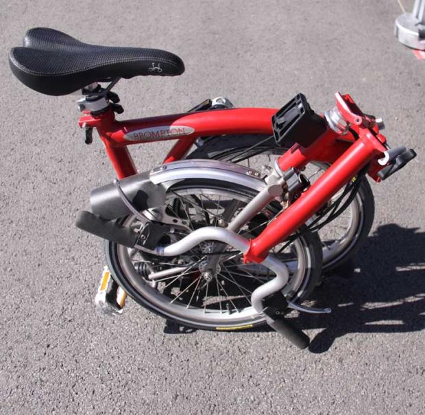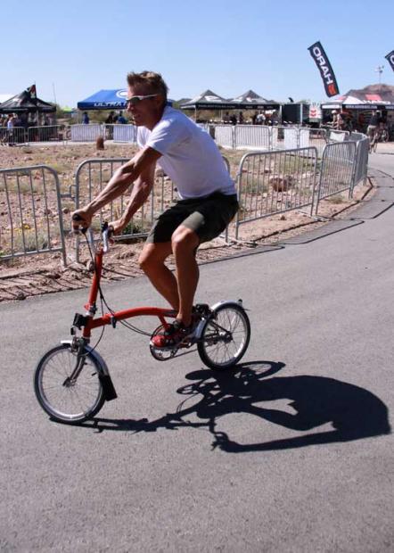 Paul Thomas of Kuota cruising on a folding Brompton bike