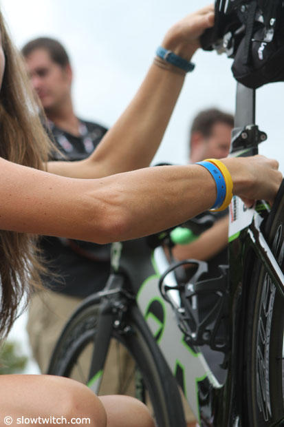 Kyle Pawlaczyck of team US Pro Tri checks in his Falco tri bike.