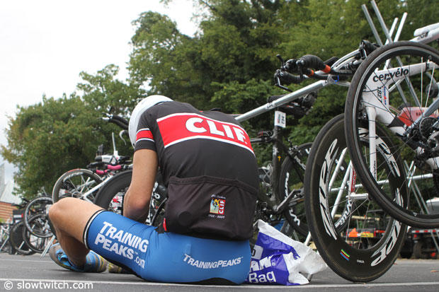 Last minute bib number adjustments before putting the bike into the transition area.