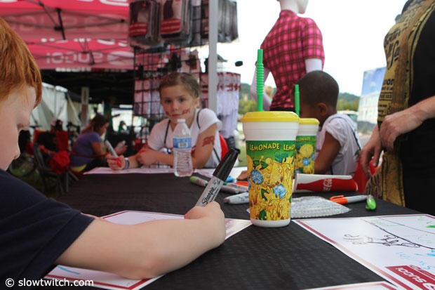 Support signs for loved ones are being drawn in the Sugoi tent.