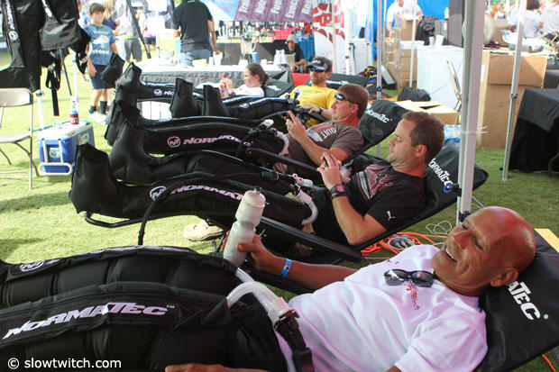 While the NormaTec boots are working hard, the people in them occupied themselves with their phones.
