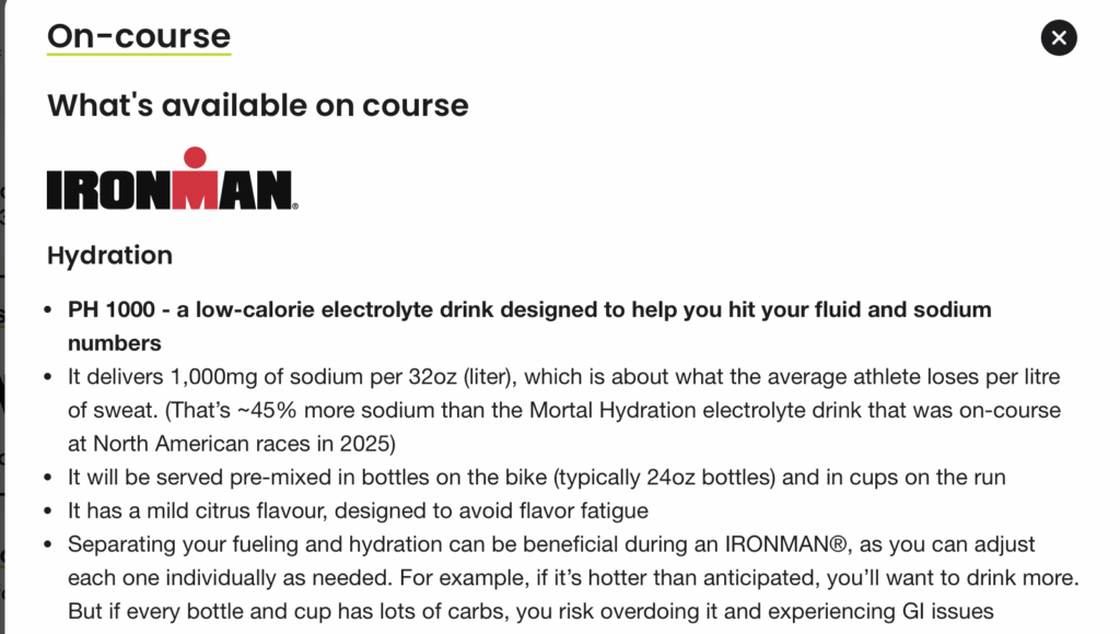 In a release announcing the deal, IRONMAN touted that, “PH 1000 is specifically formulated to help athletes manage two of the ‘Three Levers’ of endurance sports nutrition, fluid and sodium, while carbohydrates are provided by energy products from on-course fueling partner Maurten. This ‘decoupling’ of fueling and hydration has been praised by elite and amateur athletes alike for providing flexibility during longer endurance events.”