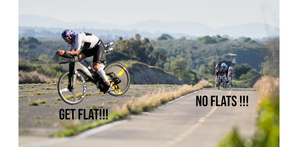 The big conversation on the bike was race favorite Kristian Blummenfelt suffering a flat on his front wheel around mile 12 or so. Not seeing the smooth path on the left side of the road KB, got caught in some rough stuff that would end up giving him another podium ending front flat tire. See what Im talking about below.