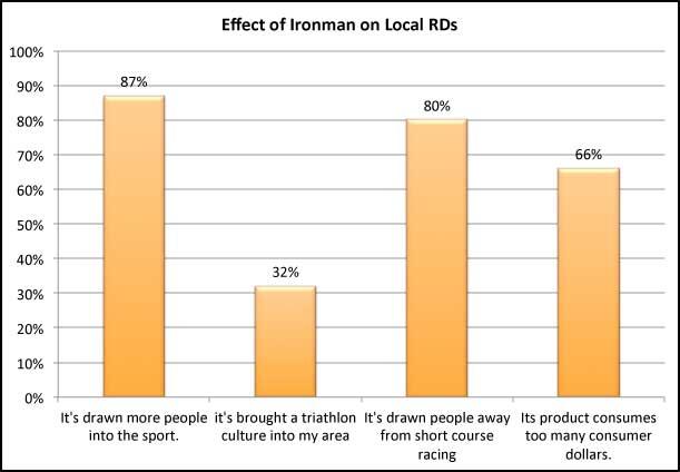 In the chart below you see the odd blessing/curse of Ironman when I ask race directors what Ironman means to their businesses. Yes, 80 percent of surveyed RDs see Ironman as drawing people away from short course racing, and 66 percent say that the sucking sound you hear is Ironman vacuuming all spendable dollars out of the pockets of triathletes. Yet 87 percent of them say that Ironman has brought new people into the sport. Still, what is the profile of Ironman-inspired newbies?