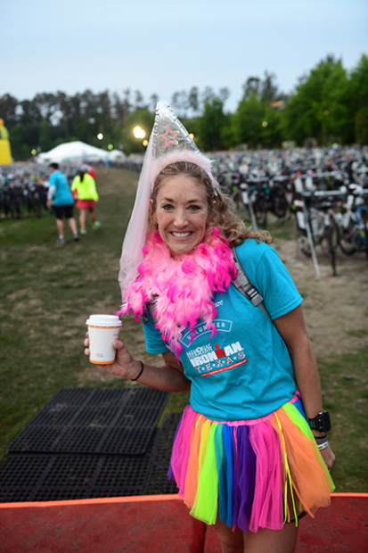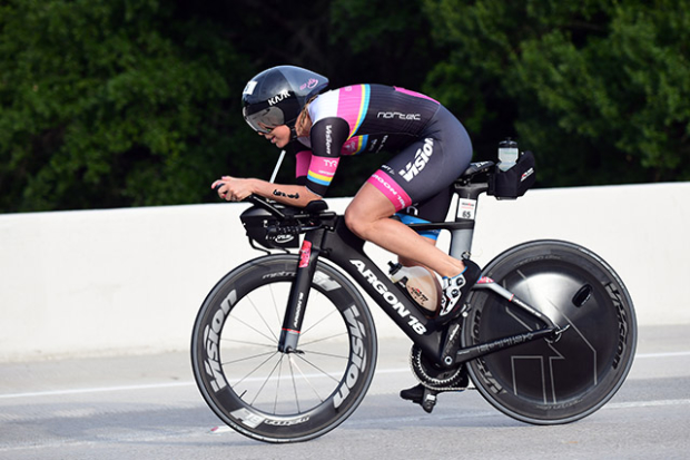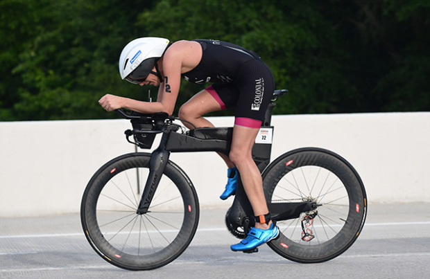 Lauren Brandon held to the lead on her way to a 4:38:15 bike split.