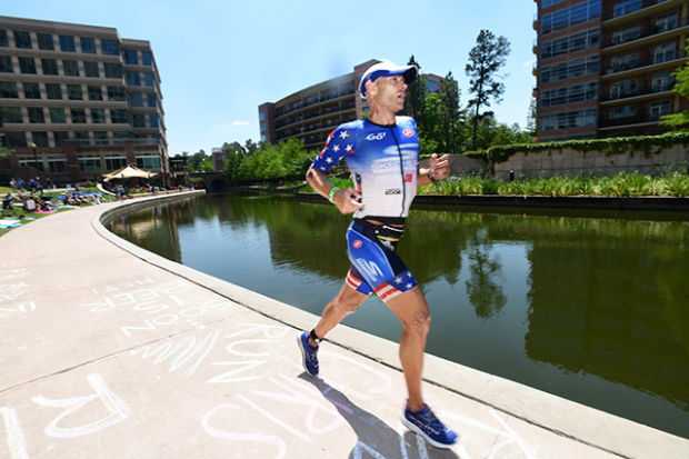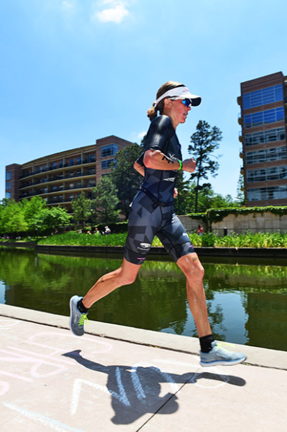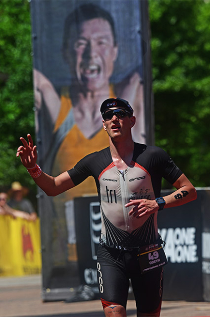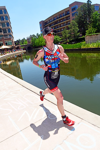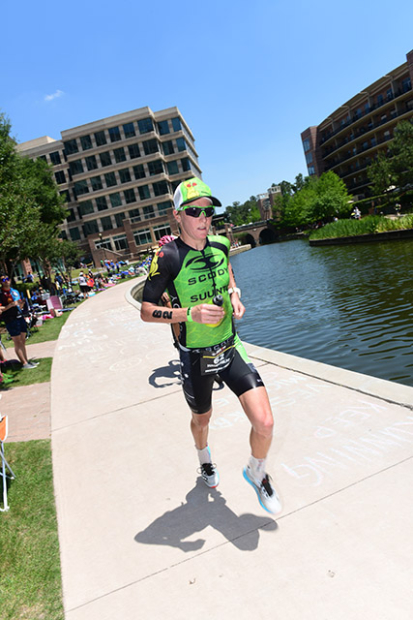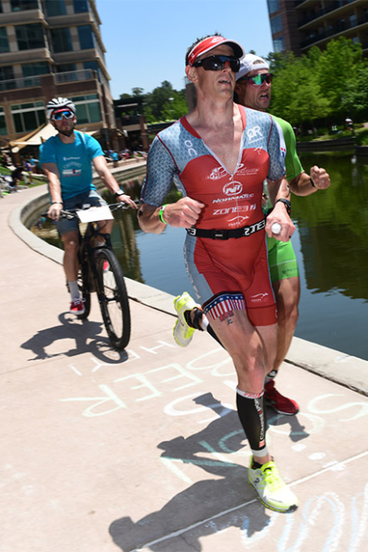 Andrew Starykowicz seems to be floating on air as he leads the field on the first lap of the run. His 3:00:57 marathon left him in 8th place.