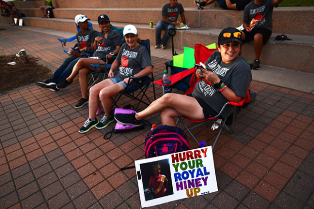 This crew took in the sunset and urged their athletes to ”Hurry Your Royal Hiney Up.”