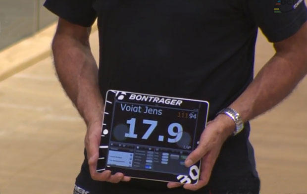 Voigt was shown his lap speed via this tablet and this was actually one of his slower laps early on.