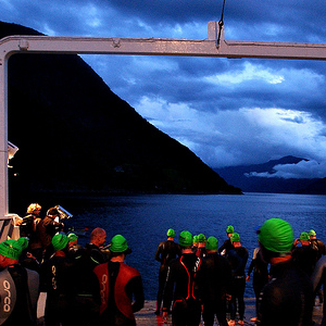 I had to get up at 2:30am, since the transition opened for check-in at 3am, and the ferry went out at 4am to the swim start. Everything felt good, but I had one problem, when I went to the bathroom 30min before start. Nothing came out, and that was a pretty big problem… I jumped the 5m from the ferry out into the water about 4:50am and swam around a bit. The water was about 17 degrees Celsius and that’s pretty good for Norseman, and with my Orca 3.8 wetsuit and Orca neoprene cap it was actually perfect swimming condition, except for the fact that we had to swim against the tide!