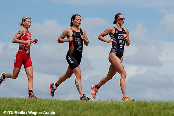 On a hot, windy day under dark clouds, Chelsea Sodaro of the U.S., a former All-American NCAA runner at UC Berkeley, broke away on the 5.2k opening run, arriving at T1 with a race-best 18:47 split that was 17 seconds ahead of a 10-woman pack that included Juri Ide, Maaike Caelers of Netherlands and Amelie Kretz of Canada at 19:04, and Katie Zaferes, Taylor Spivey and Chelsea Burns of the U.S., Romana Gajdosova of Slovakia, Adriana Barraza of Mexico, Julia Hauser of Austria, and Andrea Gonzalez of Mexico – all at 19:05.
