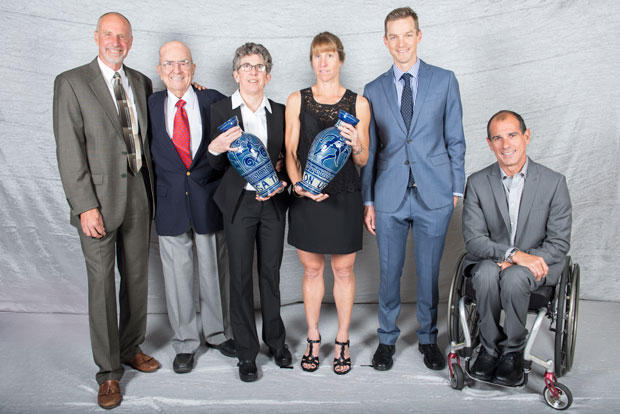 Ms. McKeachie was inducted into the USA Triathlon Hall of Fame, part of its 2014 class. She remains one of the relatively few age-group athletes to be inducted. The images here are from that induction ceremony (courtesy of Matt Hichborn). For all her notoriety she was painfully shy when speaking in public, and had a hard time getting out her speech during the Hall of Fame ceremony. Pushing through her acceptance address was a counterpoint to athletic gifts that seemed to come so natural to her, and this charmed the crowd and created for her a new round of fans.