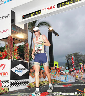 Ken: No, it was a climate shift. I was living at Penn State and going to school in State College. After getting back from Nice, it was September and I was working out in tights and long sleeves. So when I came out here, on race day I just got fried. I was 57 minutes [57:54] out of the water in about 70th place and worked my way up to 7th place on the bike. [5:22:25 split] When I got off the bike, I was in 8th and held 9th place until Mile 12. After 12, it unraveled quickly. So my bike time was 30 minutes faster than my run time. [run 5:49:25, total time 12:09:44 in ].