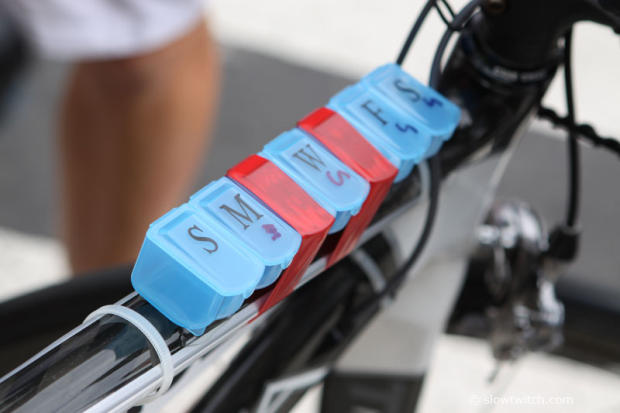 Timo Bracht's Giant rests against the fencing while he switches from his cycling shoes to running shoes.