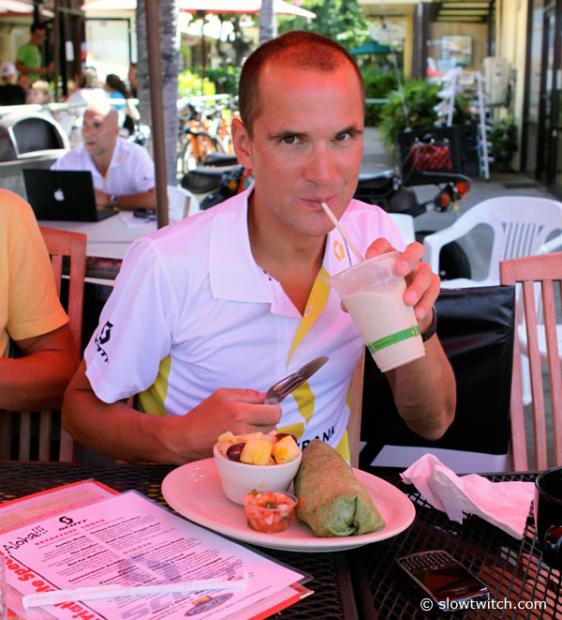Team Commerzbank Pro Maik Twelsiek enjoying a Corbin Wrap and a Linsey Shake at Lava Java during the team breakfast.