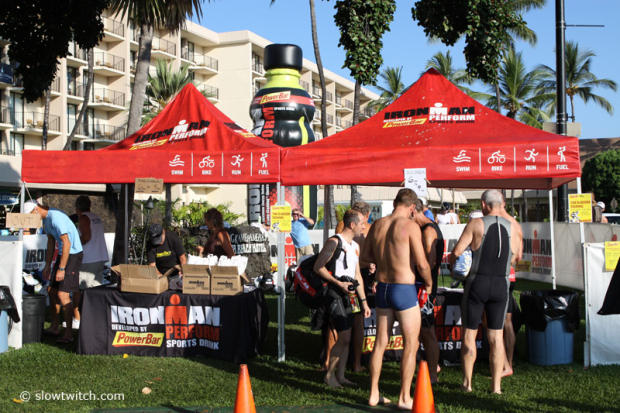 What once was green is now red. Powerbar swim gear drop off tents have replaced the Gatorade ones in Kona.