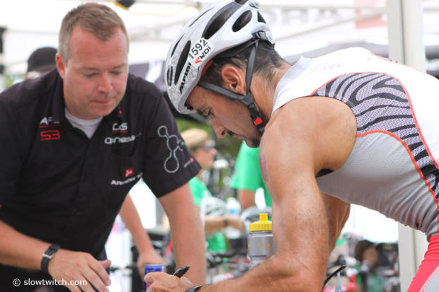 Cary from Spidertech in the process of applying the tape to the heel of an athlete here in Kona.