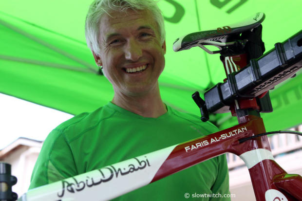 Murray Washburn of Cannondale showing love for Faris Al-Sultan who is no longer sponsored by them. But Murray worked on the bike of Faris anyway.