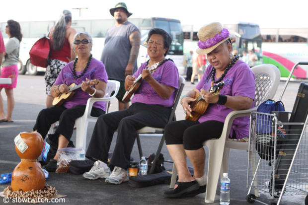 Meanwhile greeters at the pier welcome folks from the cruise ship to Kona.